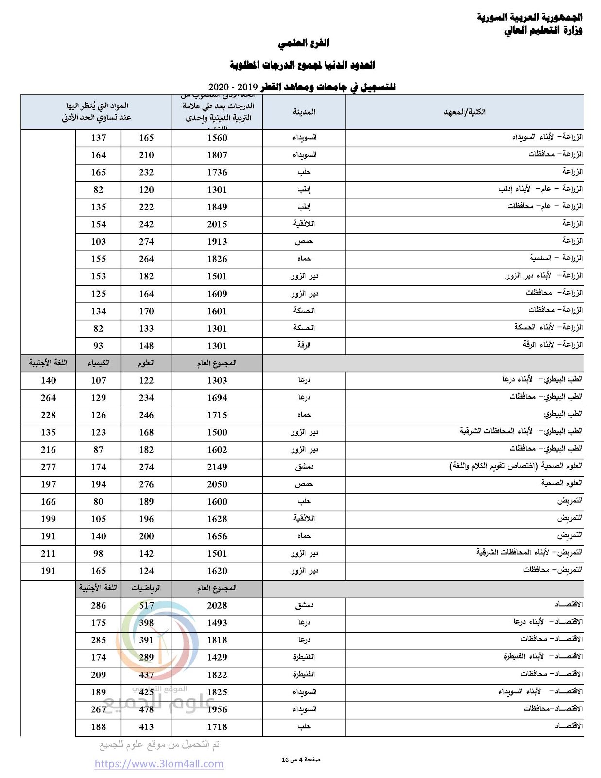 جامعة الحواش معدلات القبول في الجامعات السورية 2020